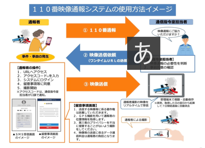 このシステムは、通常の110番通報(音声通話)をした際に、警察官が必要と判断した場合に、通報者のスマートフォンに送られるSMS(ショートメッセージサービス)のURLからアクセスして利用するものです。