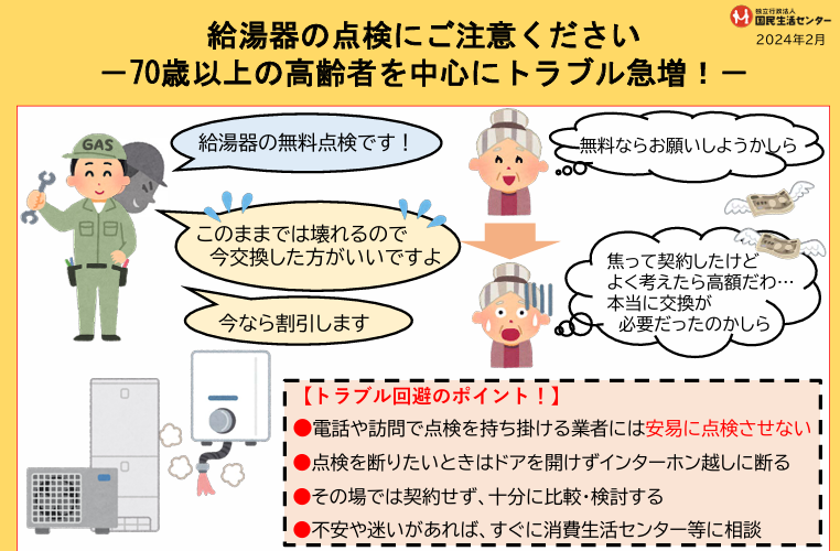 給湯器の点検業者の中には、残念ながら悪徳業者が多いことも否めません。「無料で点検します」、あるいは「このままだと危険です」といった言葉で不安をあおり、修理や高額な機器の購入を迫ってくる業者には厳重に注意が必要です。実際には点検が目的ではなく、あくまで営業行為の一環であることが多いため、すぐに点検を依頼するのではなく、必要性を冷静に見極めることが重要です。