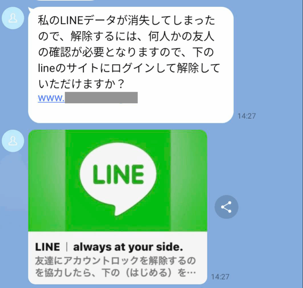 「アカウントがロックされた(またはLINEのデータが消失した)ので、以下のURLにログインして解除の手助けをしてほしい」というようなメッセージが届くことがあります。
