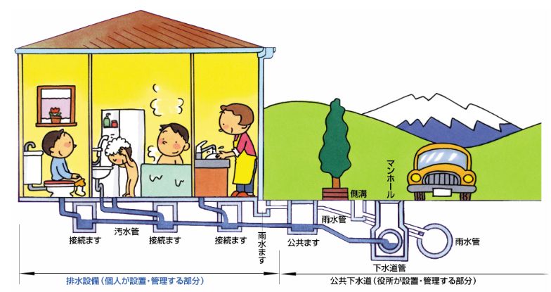 公共ますは、一般的に道路と宅地の境界付近の民地内に設置され、市町村が設置・管理します。市が依頼した業者が公共汚水桝や取付管の調査等で伺うことがありますが、その場合は予め書面等でお知らせし、市発行の身分証明書を携帯した業者が伺います。この場合も金銭を要求することはありません。