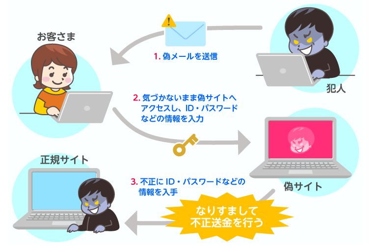 典型的な手口としては、クレジットカード会社や銀行からのお知らせと称したメールなどで、巧みにリンクをクリックさせ、あらかじめ用意した本物のサイトにそっくりな偽サイトに利用者を誘導します。