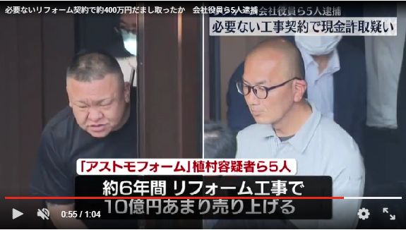 植村容疑者は「アストモホーム」の実質的経営者で、植村容疑者から指示をうけた営業担当の桜井賢司容疑者らが住宅を訪ねて、偽名を使いながら必要のないリフォーム工事をくり返し持ちかけていたということです。