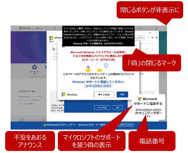 画面に記載された電話番号に電話をかけさせ、遠隔操作ソフトをダウンロード・インストールさせたり、サポートの名目で金銭を騙し取ろうとするものです。