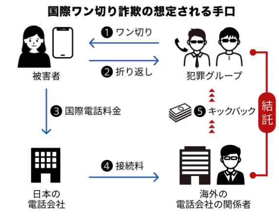 ワン切りとは: 相手に折り返し電話をかけさせるために、わざと短い時間だけ電話をかけて切断する手口です。折り返し電話をかけることで、高額な通話料を請求される可能性があります。